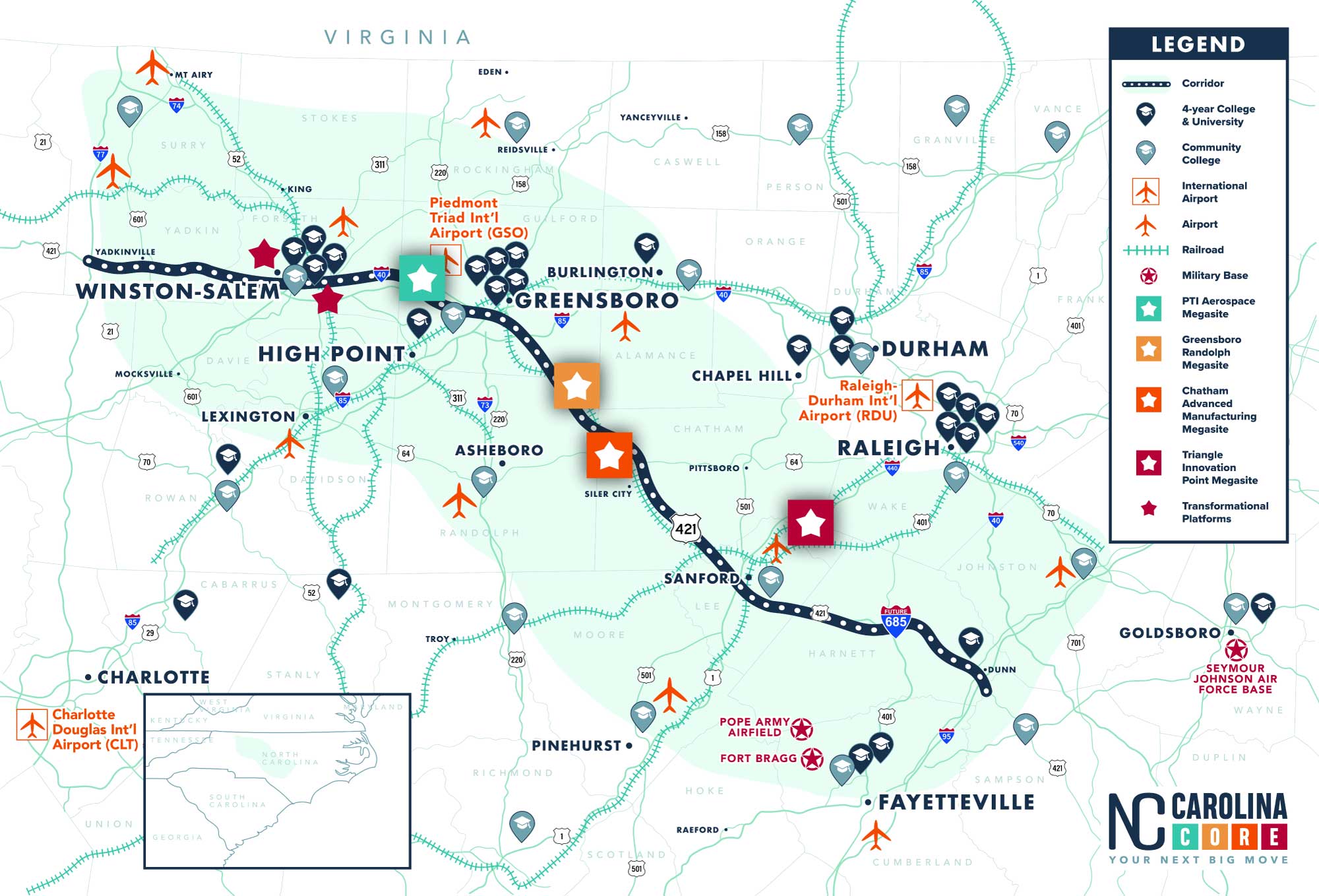 The Carolina Core—a 150+ mile swath of central North Carolina anchored by Greensboro, Winston-Salem, High Point and Fayetteville—has emerged as the state’s next economic engine, propelled by billions of dollars of recent investment from innovative companies from around the world.