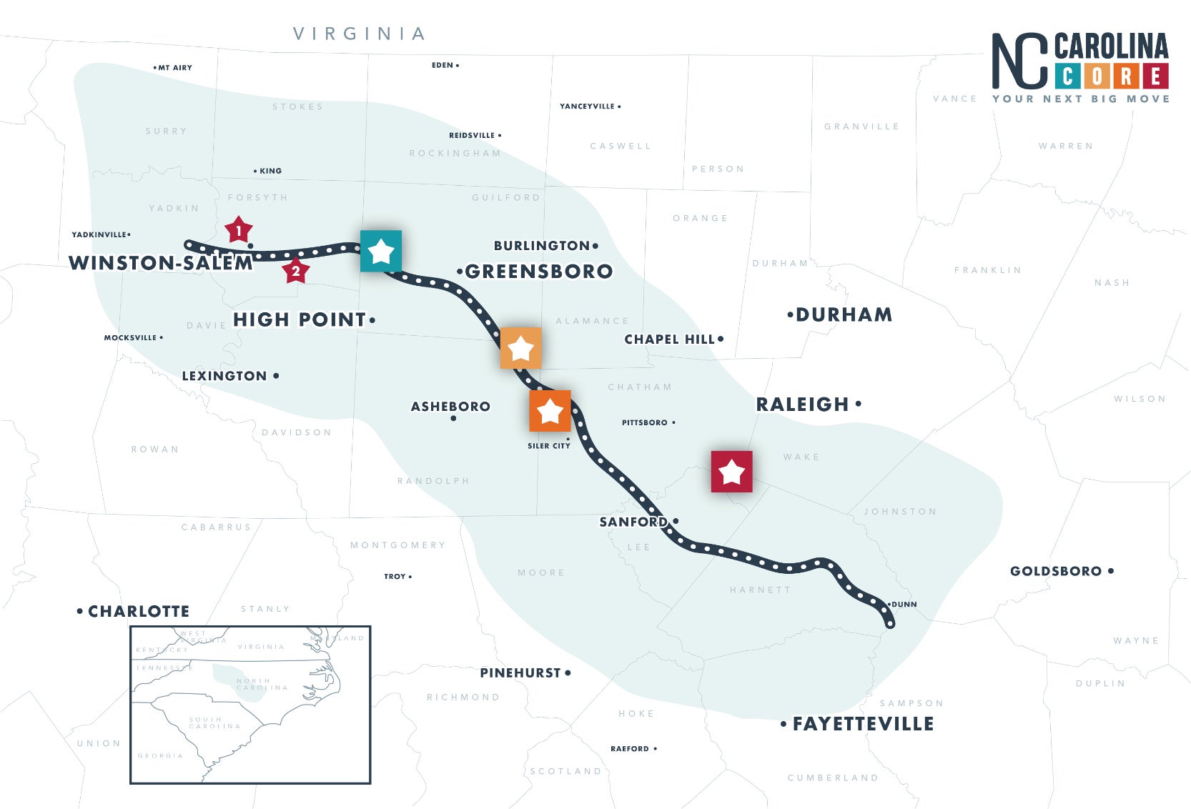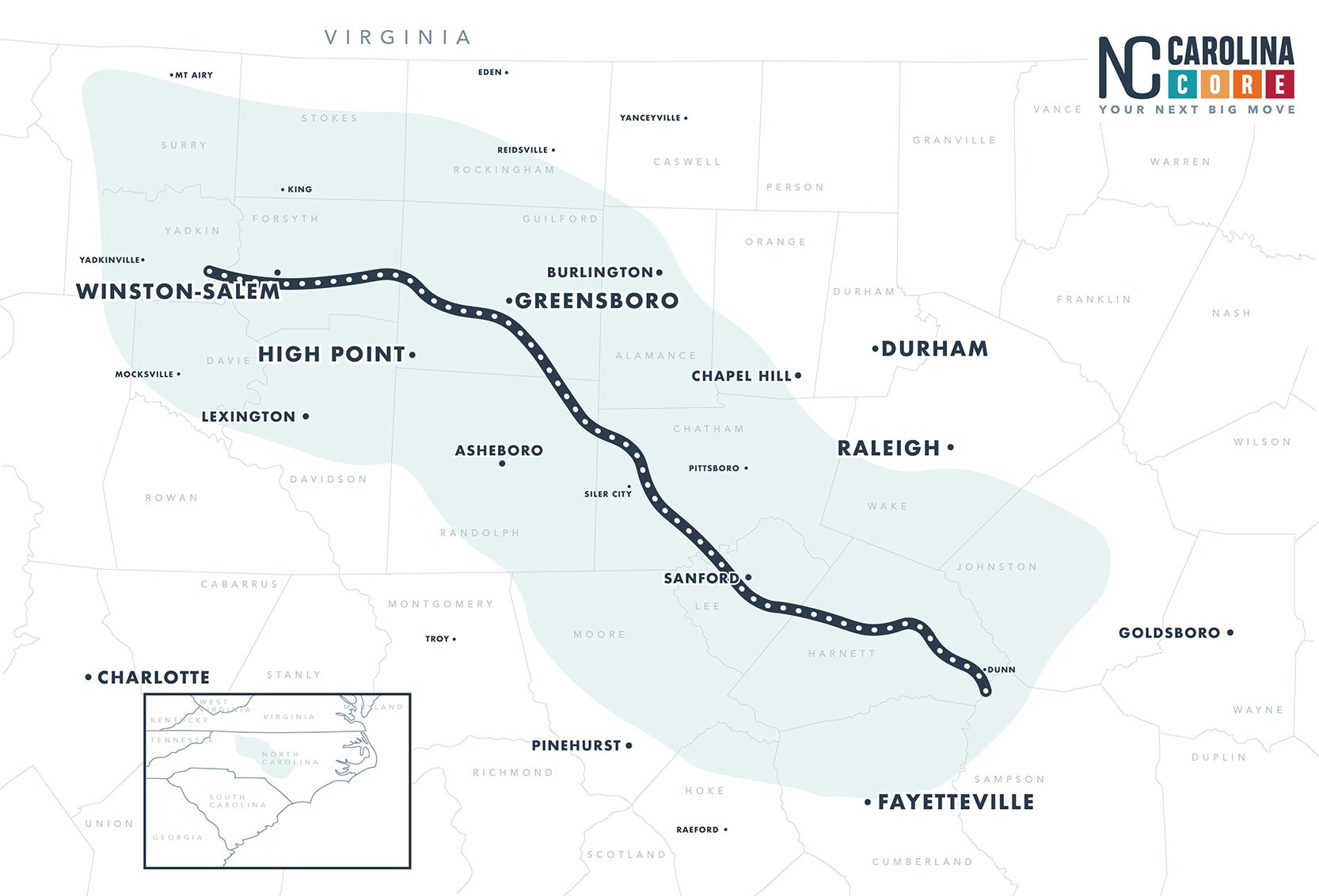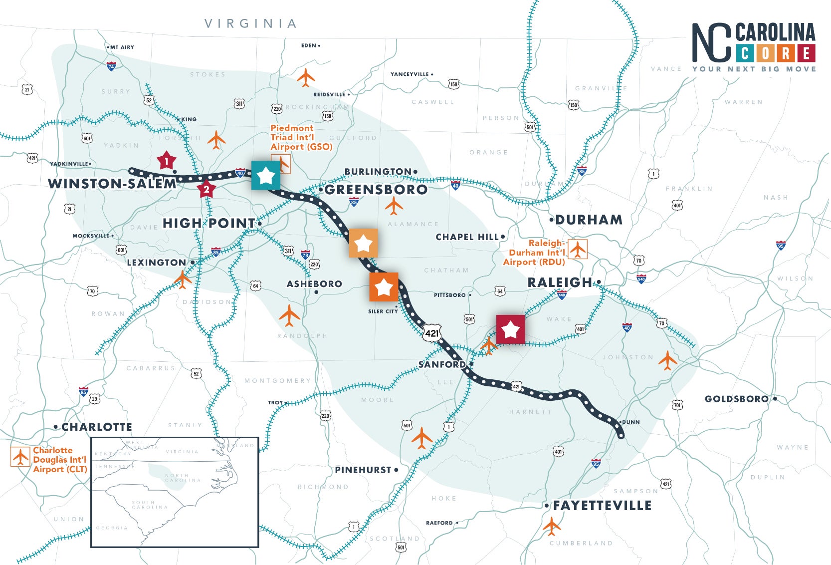 Located in the heart of North Carolina between Charlotte and the Research Triangle (Raleigh, Durham and Chapel Hill), the Carolina Core offers easy access to six interstate highways, including future I-685.