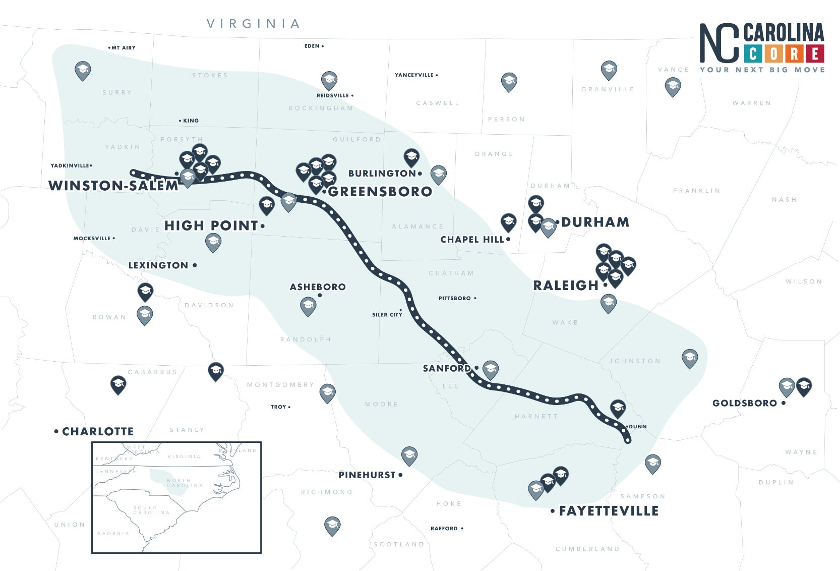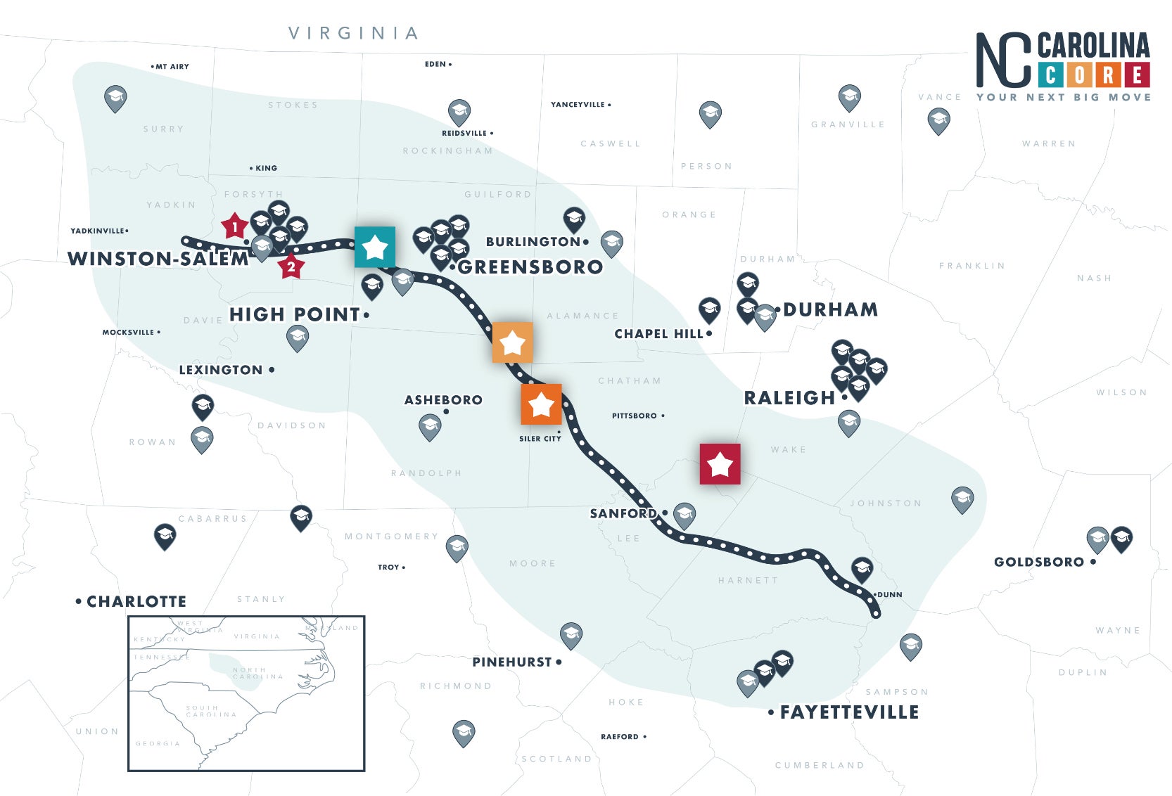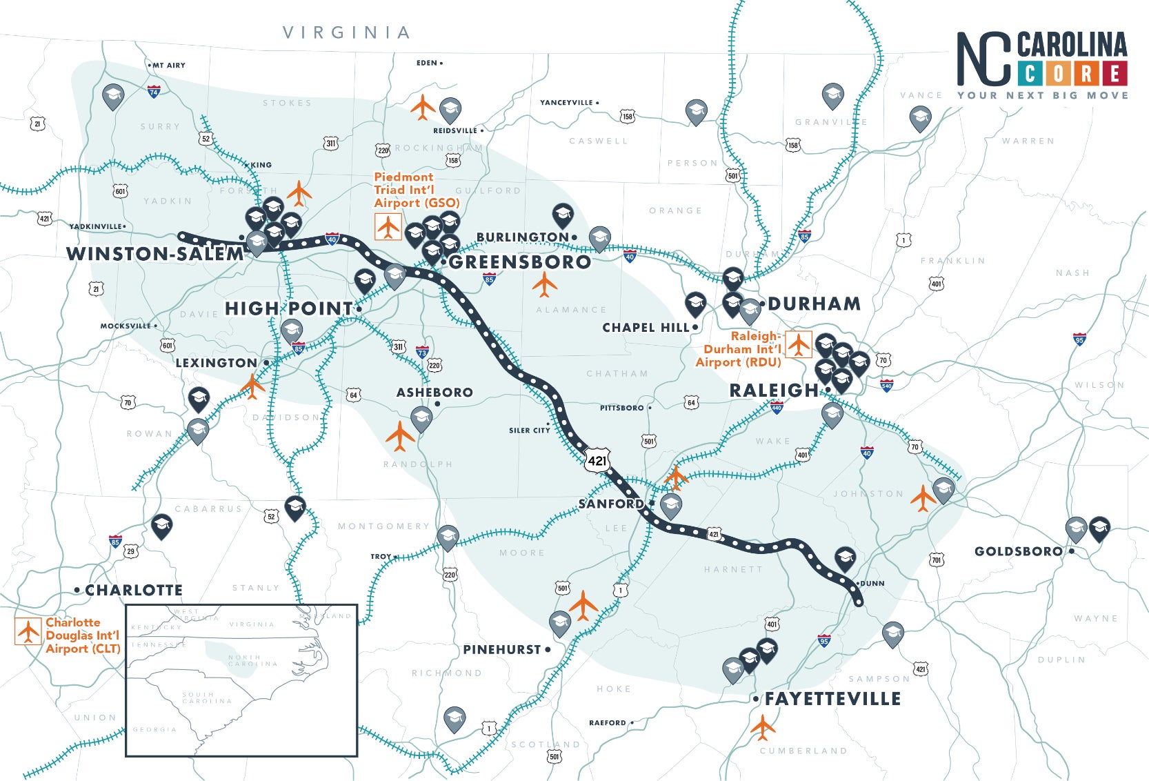 Located in the heart of North Carolina between Charlotte and the Research Triangle (Raleigh, Durham and Chapel Hill), the Carolina Core offers easy access to six interstate highways, including future I-685.